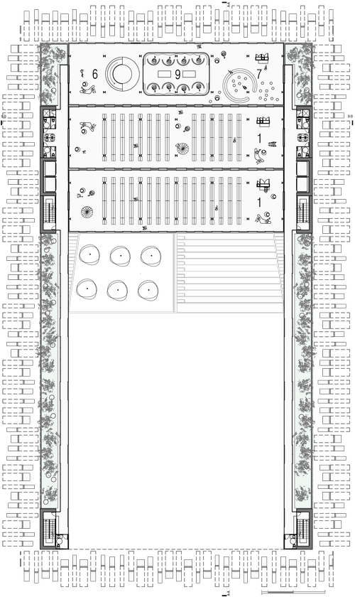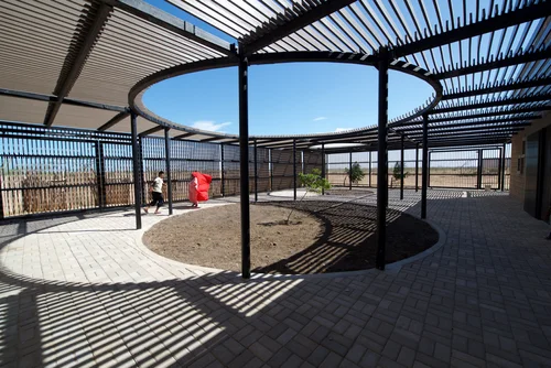 The enramada has historically been the meeting and decision-making place of the Wayuu culture, and therefore, the main source for the design of the CDI. A large pergola or shed articulates all the spaces and volumes of the CDI, protects them from the weather, and creates an intermediate space between the classrooms and the exterior which has the capacity to accommodate both the CDI and community uses. This shaded space also has openings which allow the center's users to incorporate cultural components into their daily lives such as farming, animal husbandry, and spiritual dances. The enclosure uses the same material as the pergola and is composed of a series of gates that blur the boundaries and give a public sense to the shaded area. The community built a barrier in yotojoro to protect the building from the sand and wind, and also planted trees that, like the barrier, will help protect the CDI from the wind and sand. barrier will help protect the CDI once they grow.