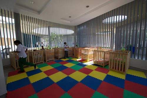 The building is next to the school and the health center of the ranchería, allowing the three institutions together to become a community space. The building's stage is designed to allow the community to hold activities and celebrations without interrupting the CDI's service or for use on weekends and evenings. To facilitate such activities, the walls of the enclosure are pivoting doors that allow access to the outdoor and shaded areas of the CDI. shaded areas of the CDI.